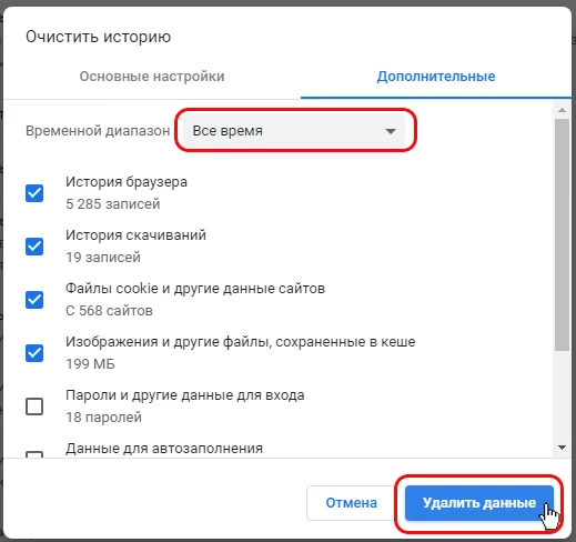 5. В появившемся окне выберите временной интервал "Все", оставьте галочку только на "Кэш";